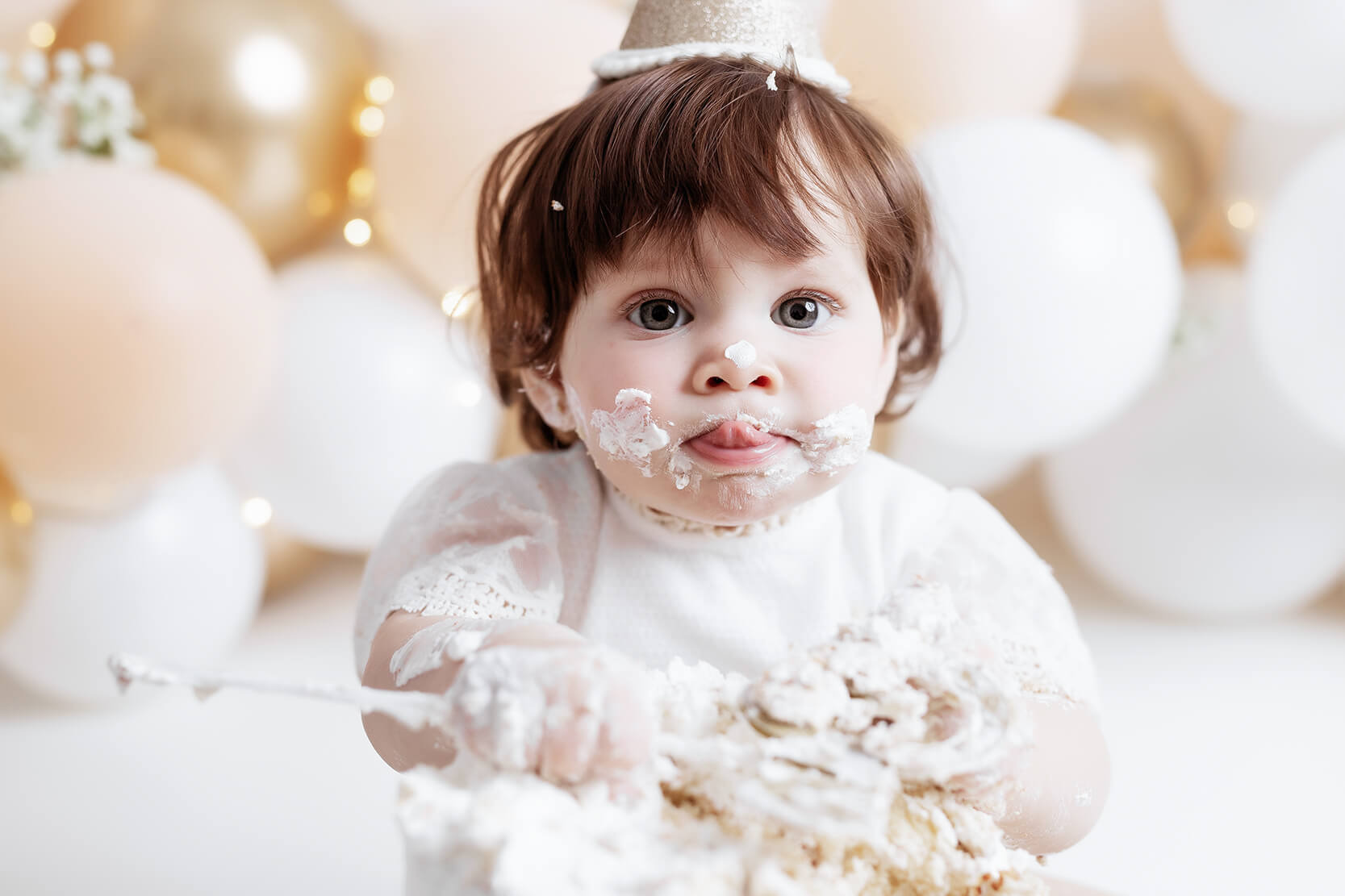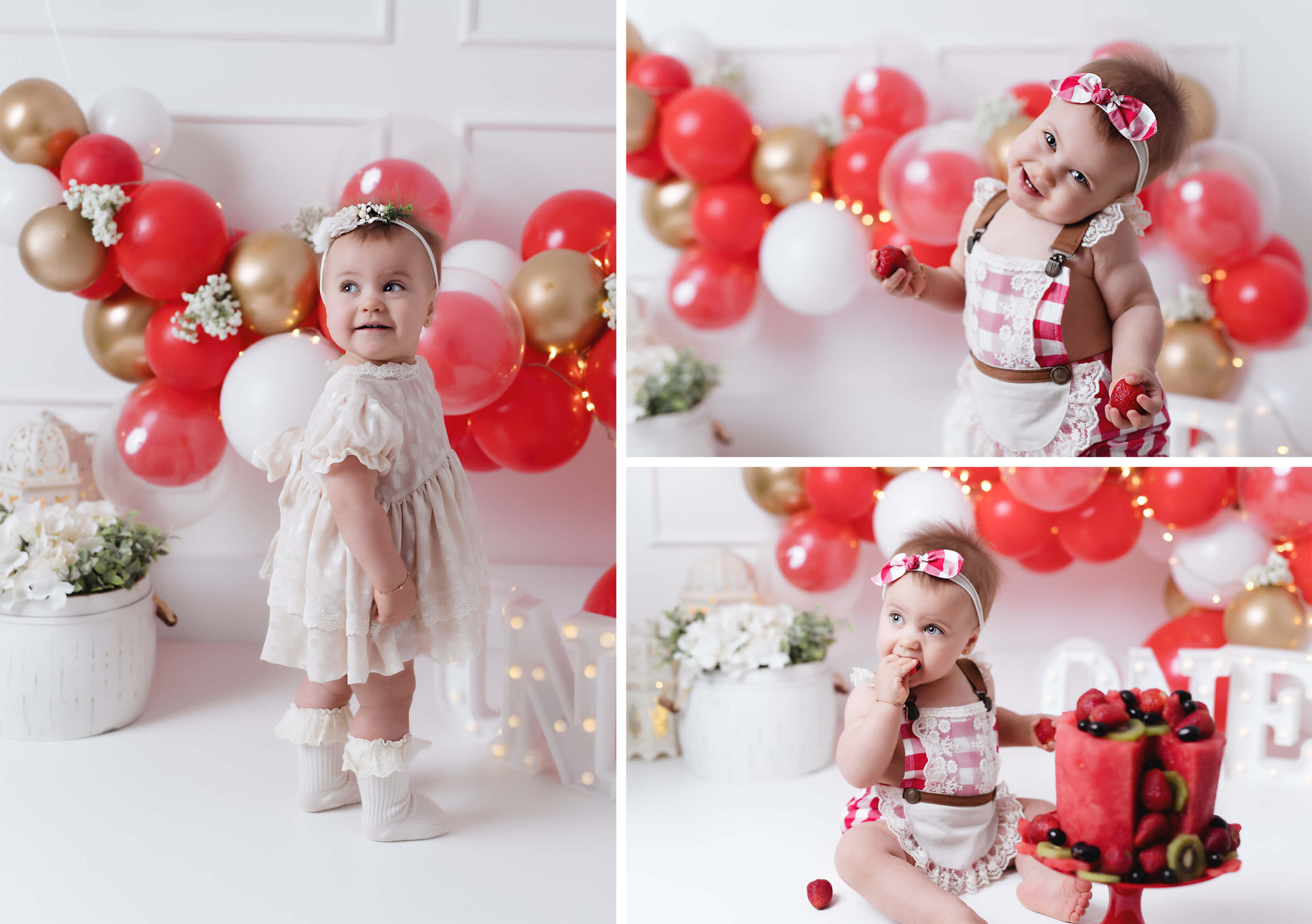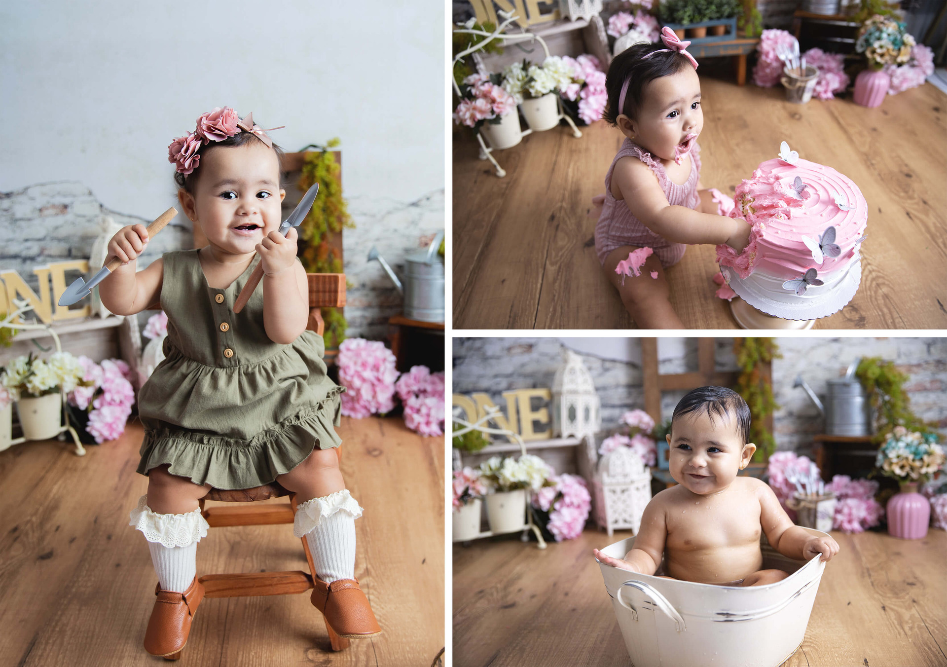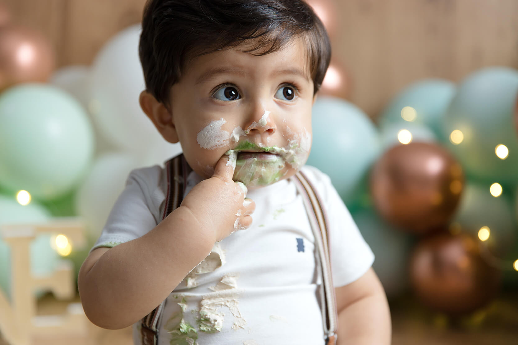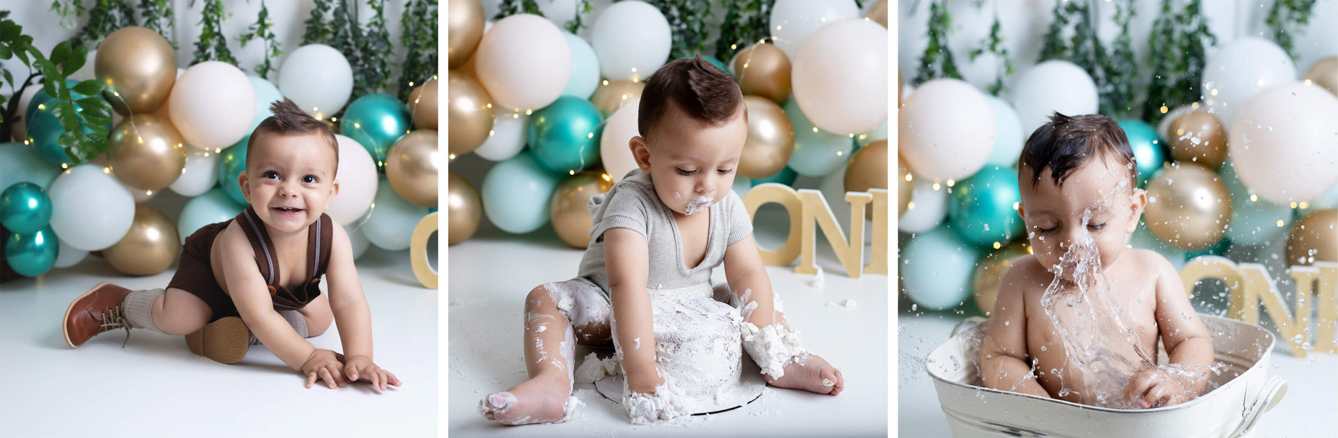 - O ensaio tem fases diferentes de acordo com o pacote escolhido. Primeiro faço as fotos do bebê no cenário e fotos com a família, em seguida vamos brincar com o bolo, hora da lambança! Para finalizar, a parte que eles mais gostam, o banho, muitas gargalhadas e água pra todo lado!
